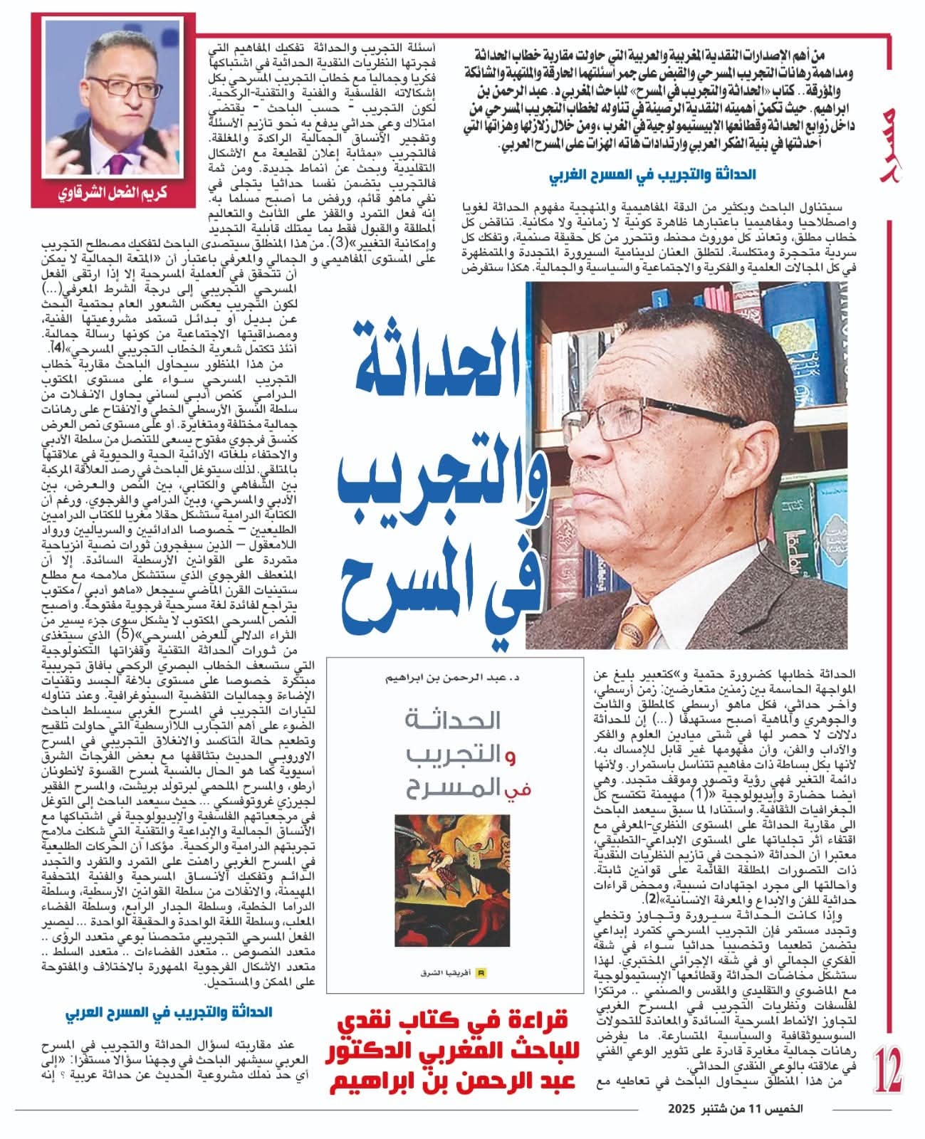 من أهم الإصدارات النقدية المغربية والعربية التي حاولت مقاربة خطاب الحداثة ومداهمة رهانات التجريب المسرحي والقبض على جمر أسئلتهما الحارقة والملتهبة والشائكة والمؤرقة.. كتاب "الحداثة والتجريب في المسرح" للباحث المغربي د. عبد الرحمن بن ابراهيم. حيث تكمن أهميته النقدية الرصينة في تناوله لخطاب التجريب المسرحي من داخل زوابع الحداثة وقطائعها الإبيستيمولوجية في الغرب، ومن خلال زلازلها وهزاتها التي أحدثتها في بنية الفكر العربي وارتدادات هاته الهزات على المسرح العربي.